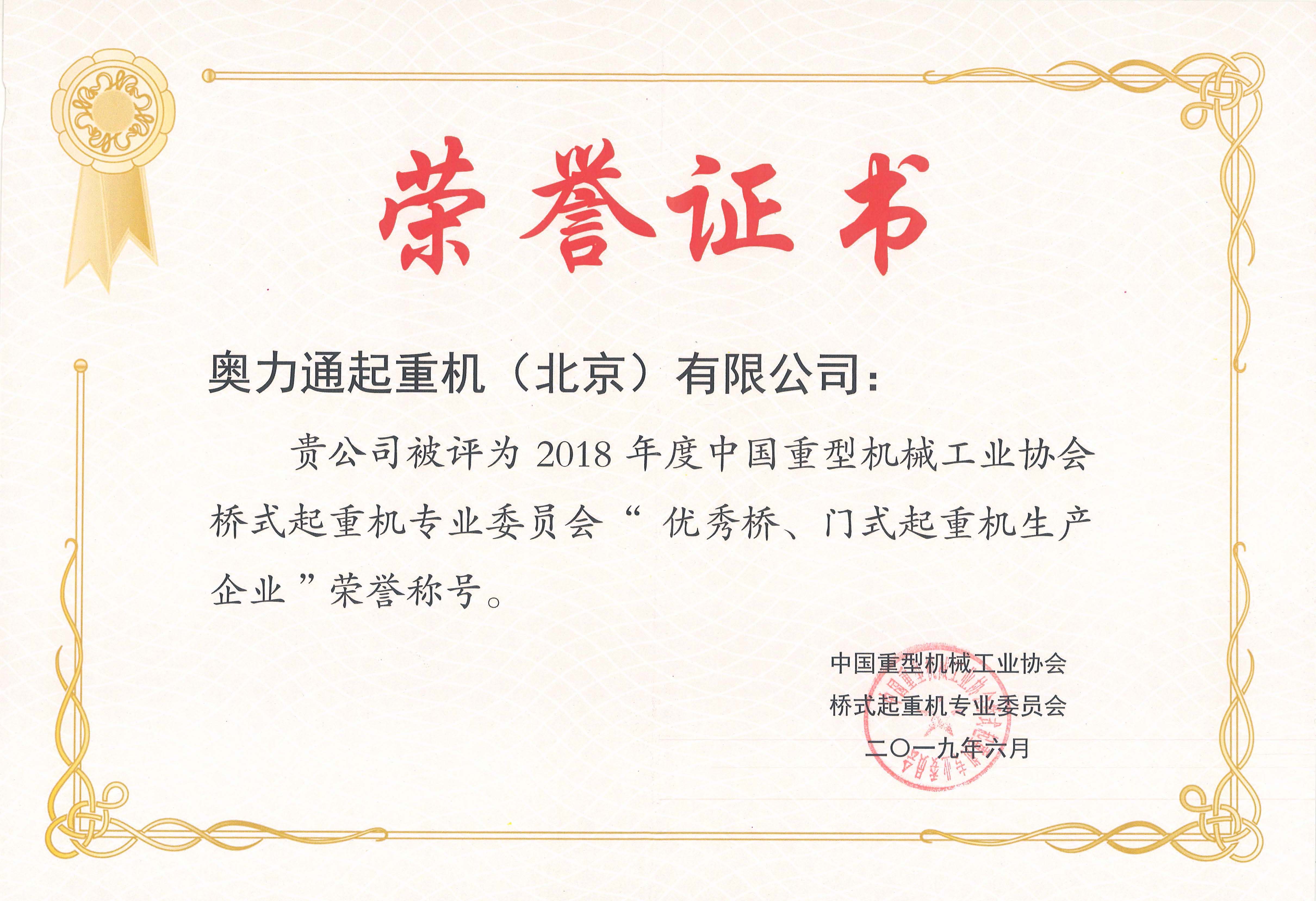 (米兰milan荣获2018年度“优秀桥、门式起重机生产企业”)